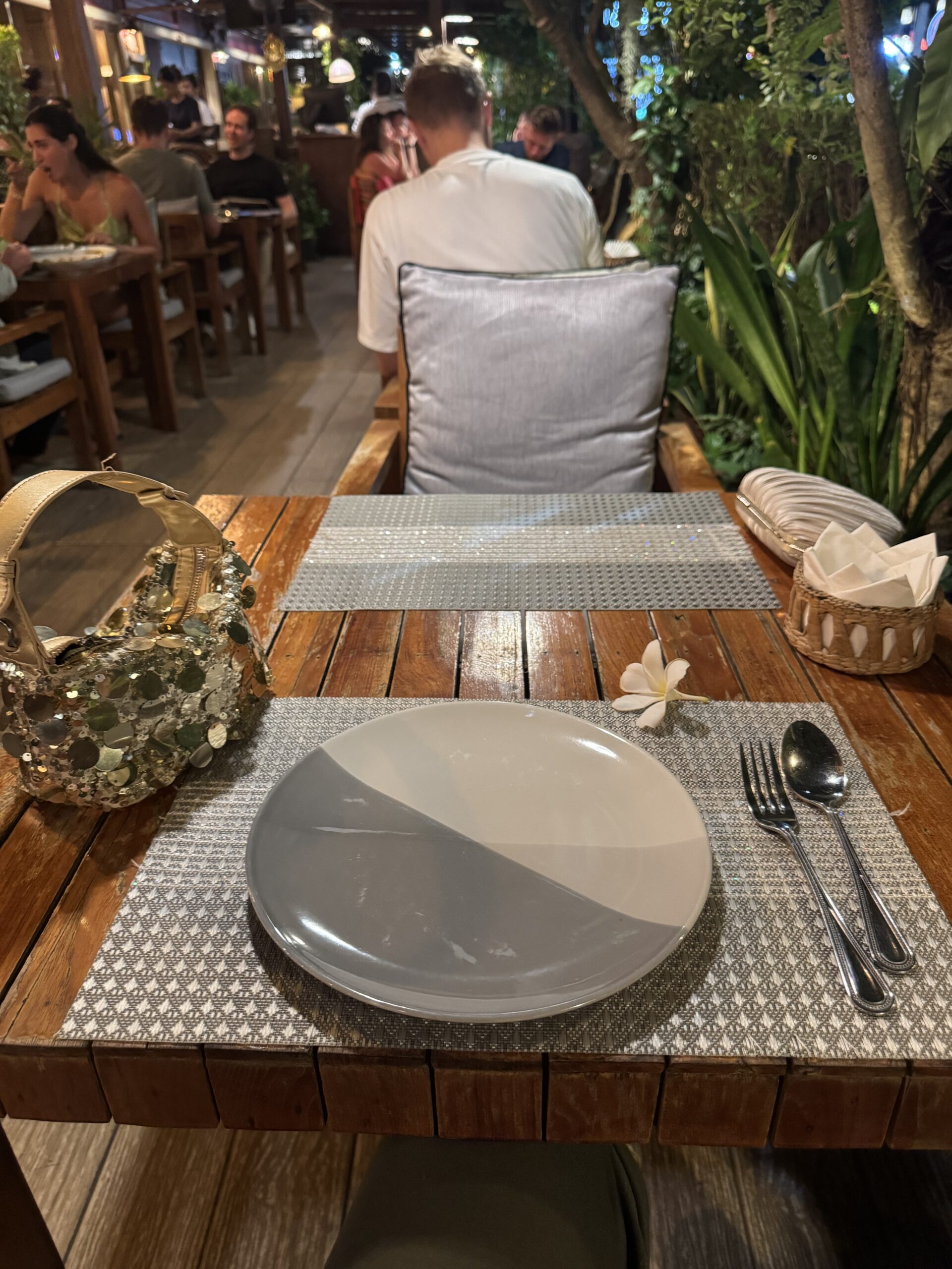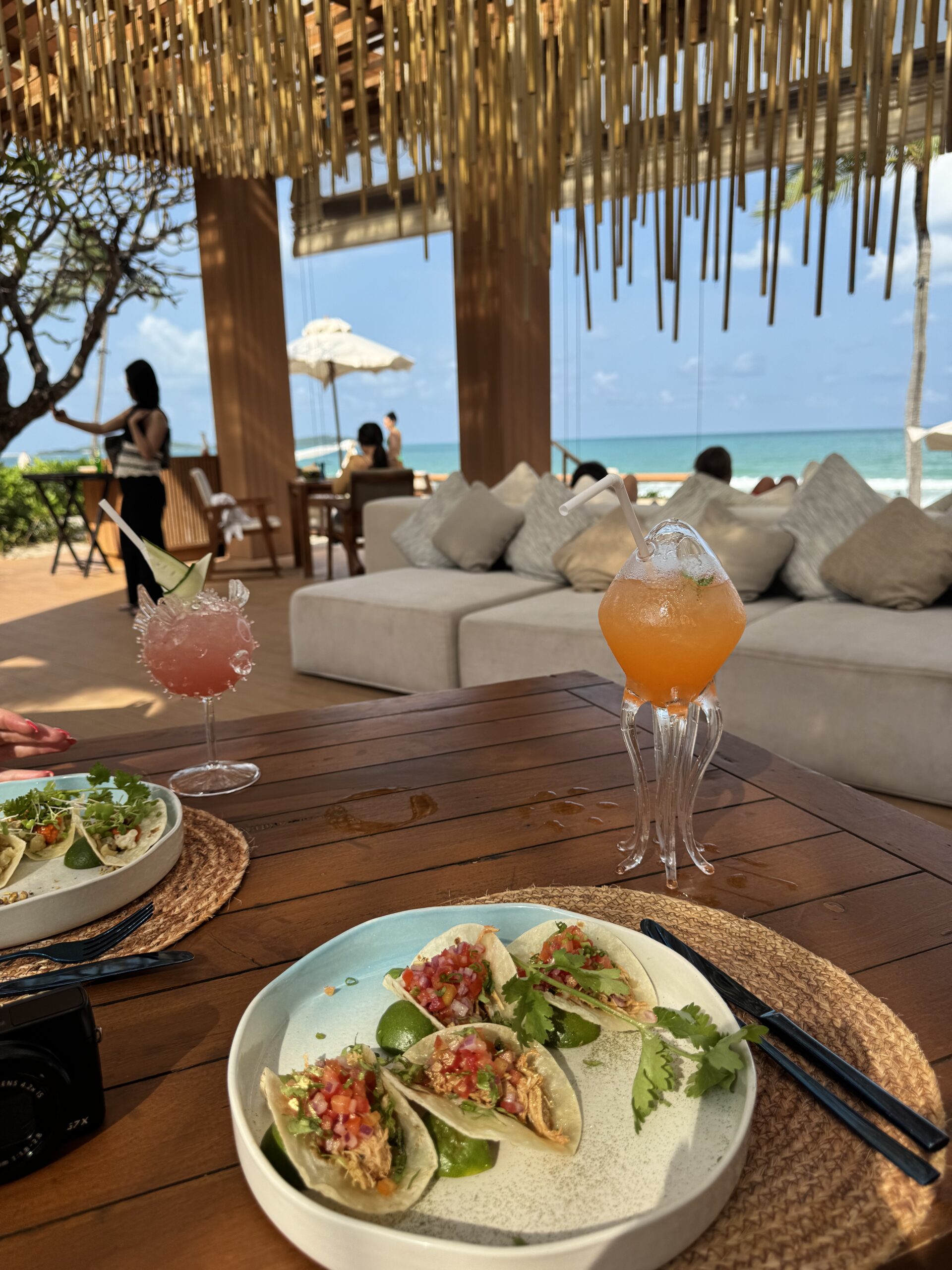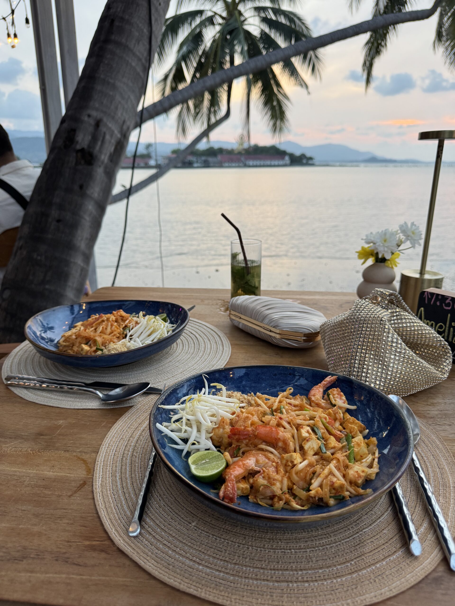 For dinner this evening, I would recommend reserving a table at Sea La Vie restaurant, which has the most incredible location right on the seafront with the prettiest sunset. Make sure to reserve a table in time for sunset and request a table at the waterfront if possible. I would recommend taking some mosquito spray with you because as soon as the sun sets, they come out, but the restaurant did put some on the tables, which was really nice. Then I would head back into Chaweng town for some drinks. We went to Chom Chada cocktail bar, which was really good. They served great cocktails, and it was a nice, relaxed vibe. We then got a banana pancake from one of the stalls on the way back, which was amazing.