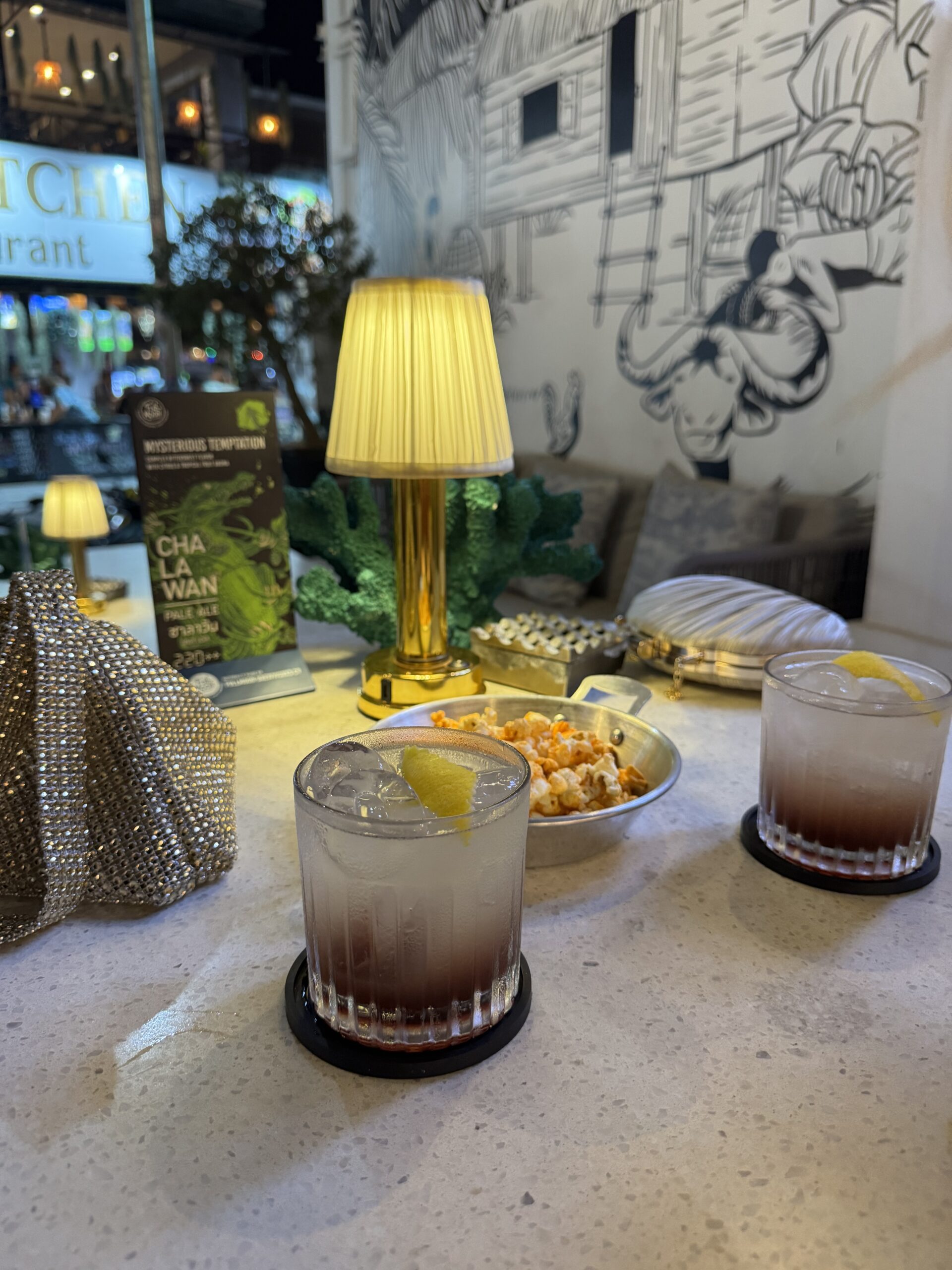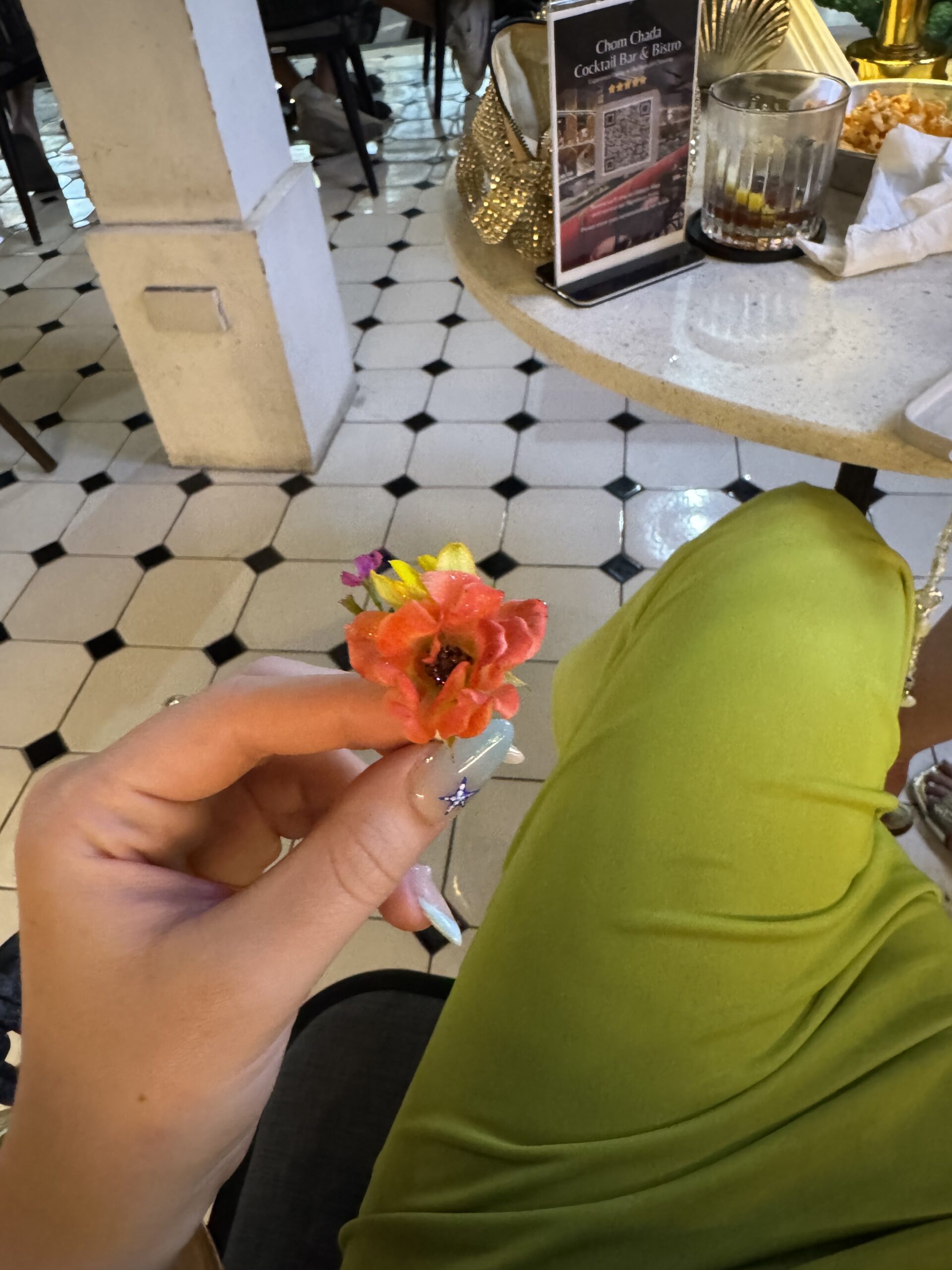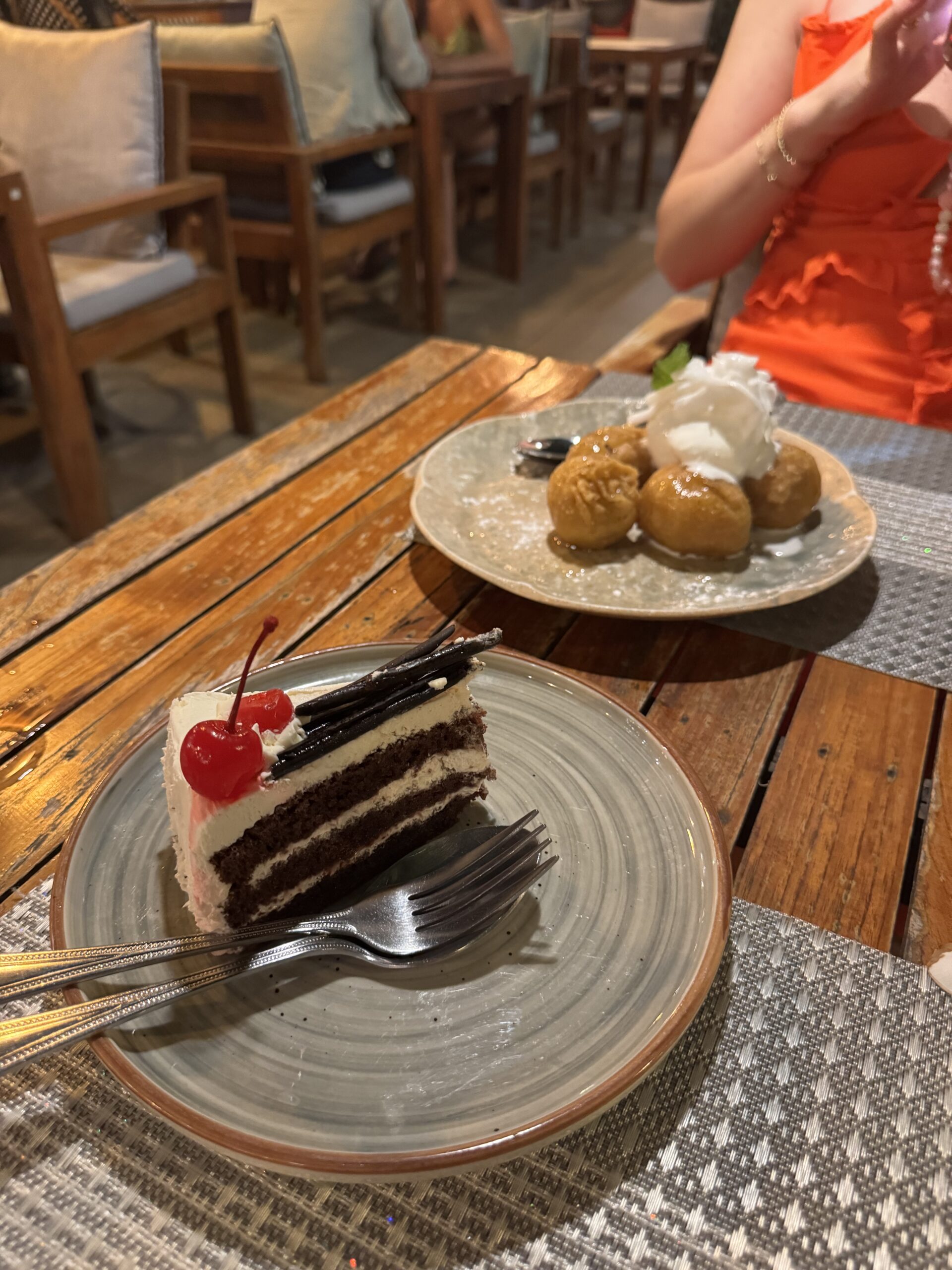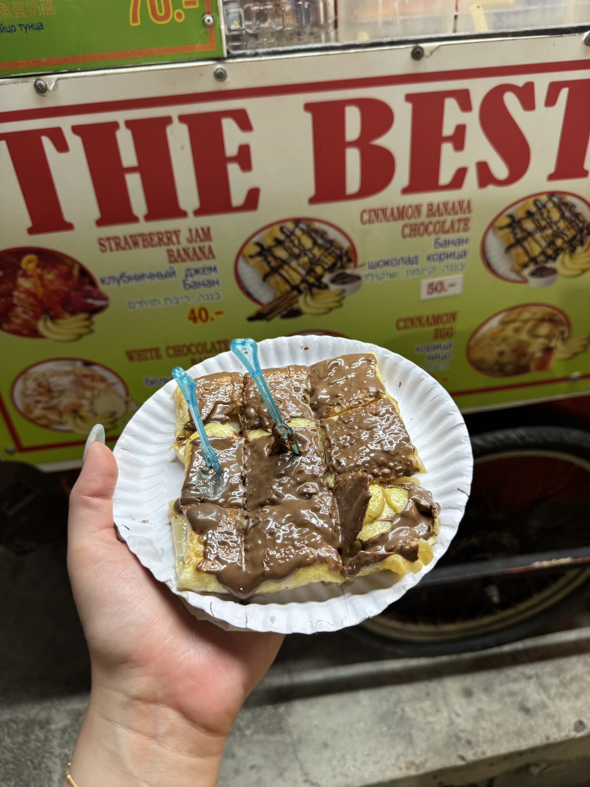 For dinner this evening, I would recommend reserving a table at Sea La Vie restaurant, which has the most incredible location right on the seafront with the prettiest sunset. Make sure to reserve a table in time for sunset and request a table at the waterfront if possible. I would recommend taking some mosquito spray with you because as soon as the sun sets, they come out, but the restaurant did put some on the tables, which was really nice. Then I would head back into Chaweng town for some drinks. We went to Chom Chada cocktail bar, which was really good. They served great cocktails, and it was a nice, relaxed vibe. We then got a banana pancake from one of the stalls on the way back, which was amazing.